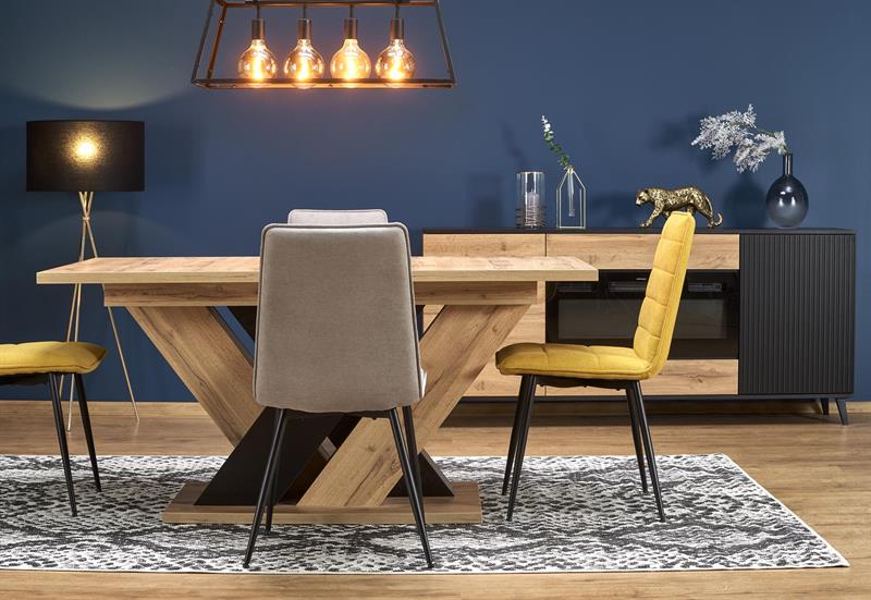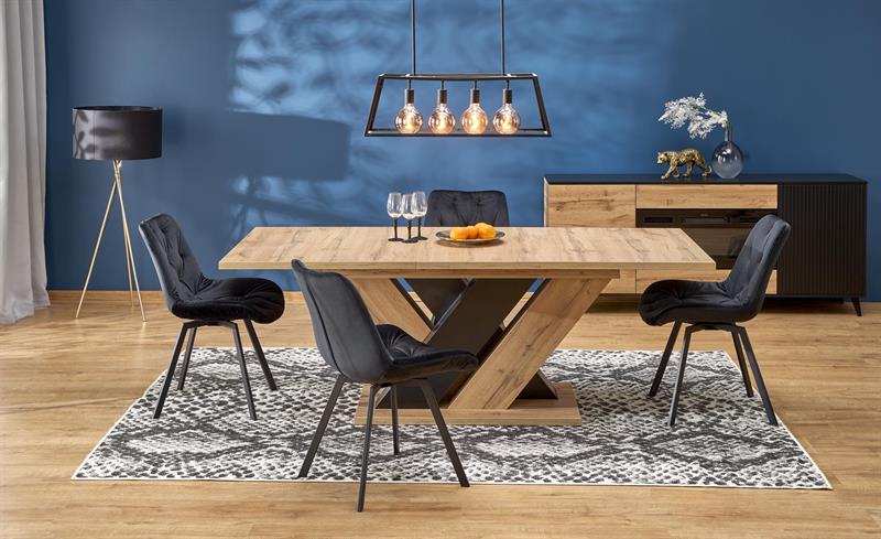 Blat wykonany z wysokiej jakości laminowanej płyty meblowej gwarantuje trwałość, odporność na uszkodzenia oraz łatwość w utrzymaniu czystości. Modne zestawienie koloru dąb wotan z czernią podkreśla nowoczesny styl stołu i świetnie komponuje się z różnymi aranżacjami – od loftowych po klasyczne.