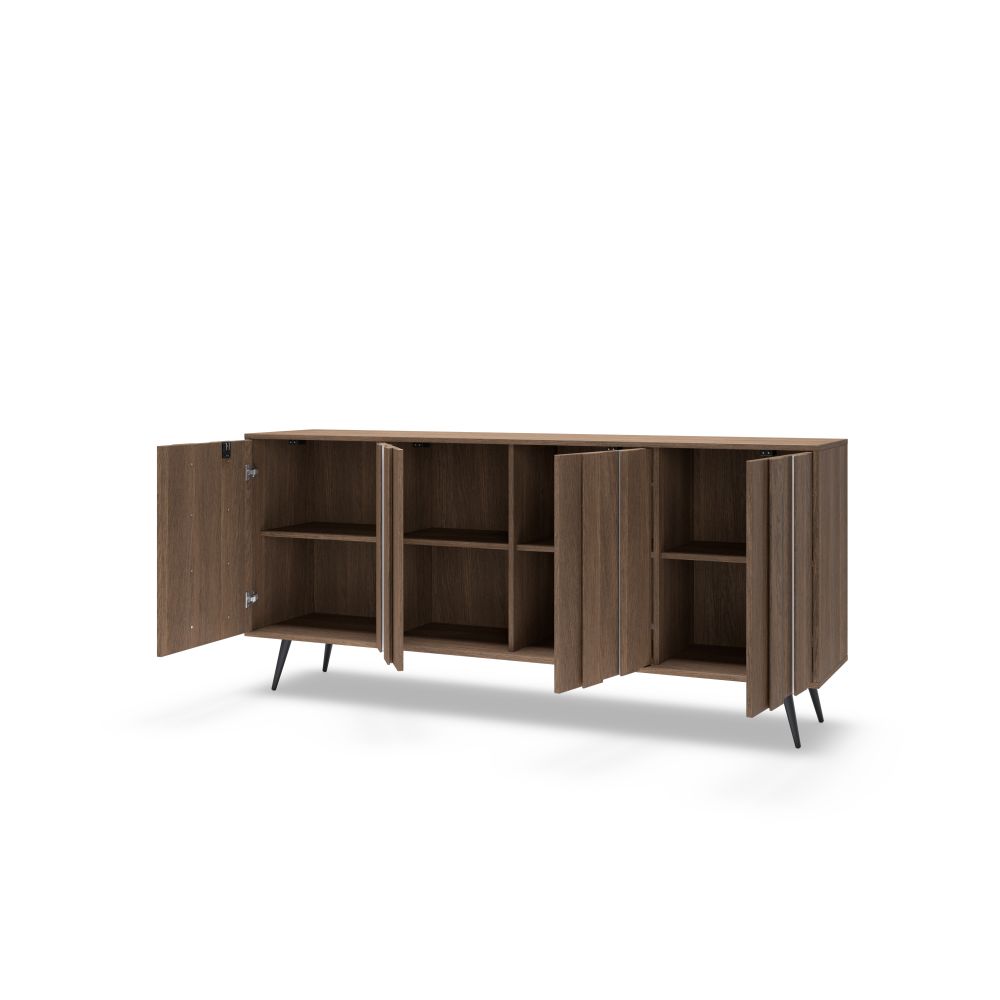 Komoda HEBAN została osadzona na smukłych, metalowych nogach w czarnym kolorze, które dodają jej lekkości i podkreślają nowoczesny styl. Dzięki temu świetnie sprawdzi się zarówno w aranżacjach loftowych, industrialnych, jak i bardziej klasycznych przestrzeniach z nutą elegancji.
