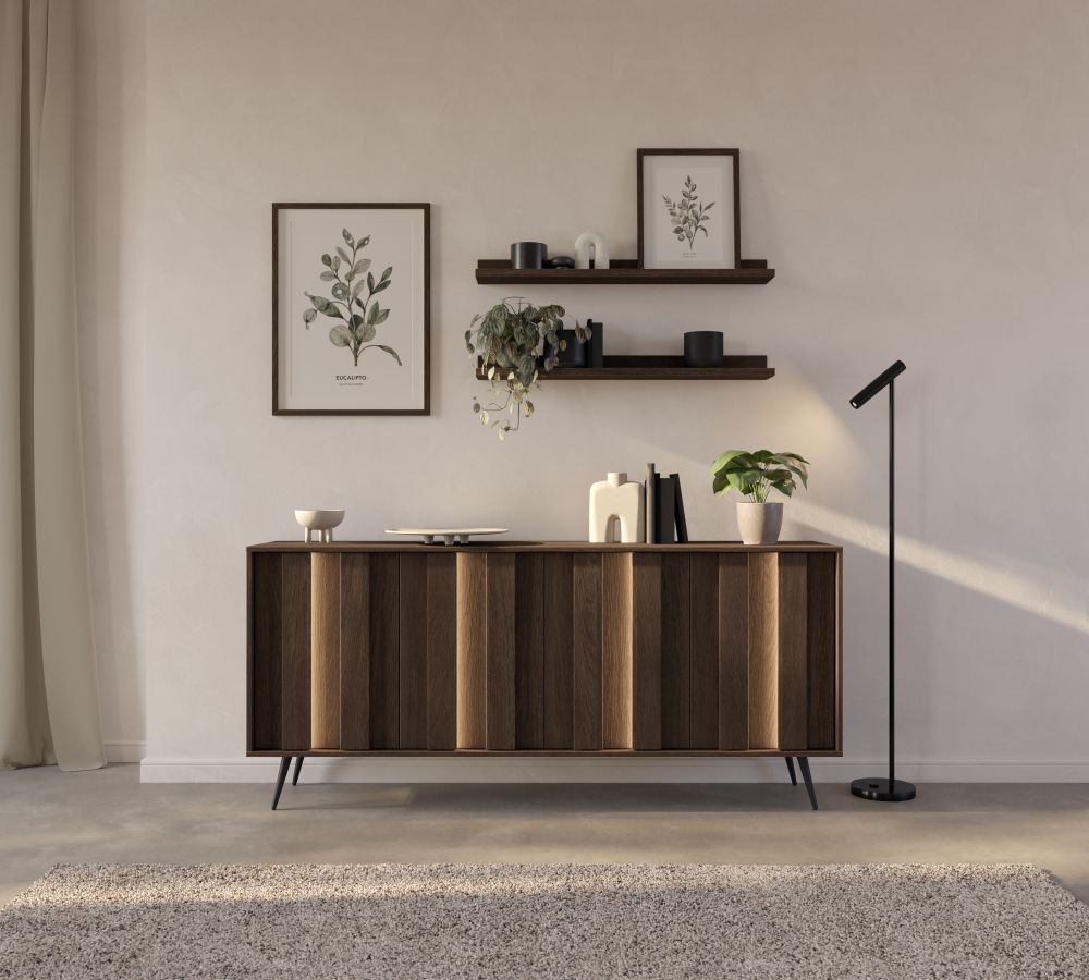 Minimalistyczna forma komody została przełamana dekoracyjnymi, pionowymi wstawkami na frontach, które nadają bryle nowoczesnej dynamiki. Brak klasycznych uchwytów podkreśla jej elegancki wygląd – jedna z listew MDF pełni funkcję uchwytu, natomiast druga skrywa subtelne oświetlenie LED. Ciepła barwa światła tworzy przytulny klimat i pięknie eksponuje strukturę drewna, co sprawia, że komoda z podświetleniem LED staje się nie tylko meblem, ale również elementem dekoracyjnym wnętrza.