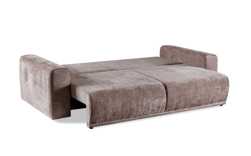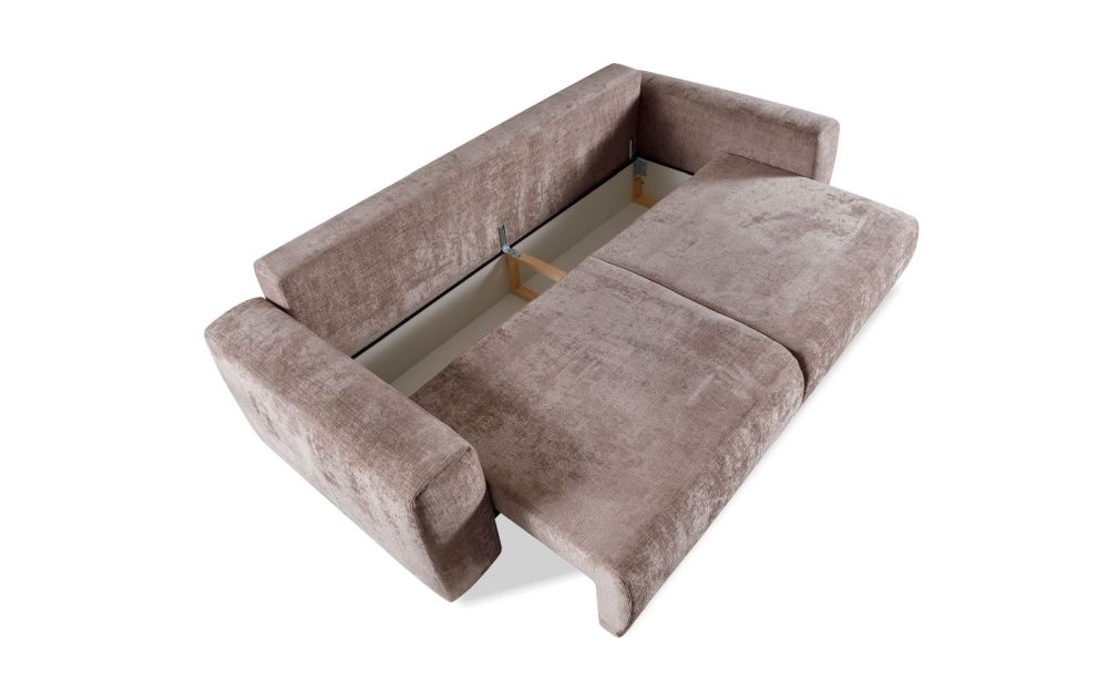 Model wyposażono w funkcję spania codziennego, dzięki czemu rozkładanie sofy jest szybkie i wygodne, a duża powierzchnia spania zapewnia komfortowy sen. Praktyczny pojemnik na pościel ułatwia przechowywanie i pomaga utrzymać porządek.
