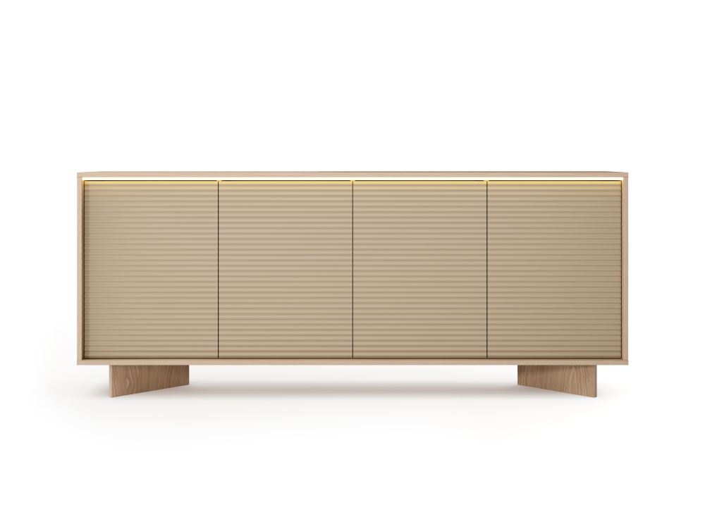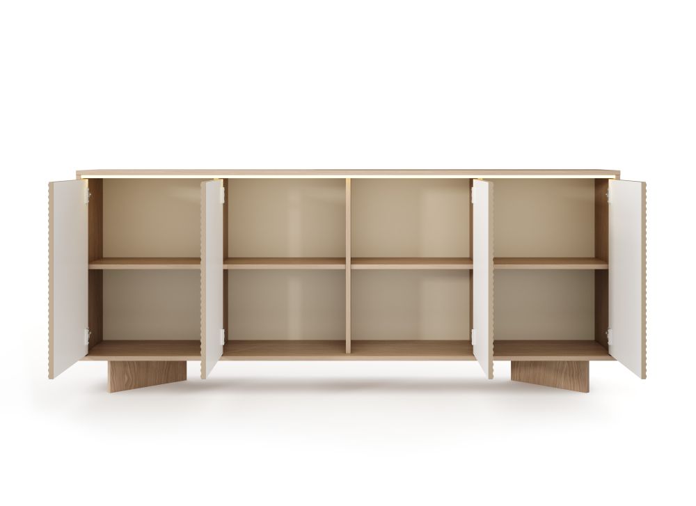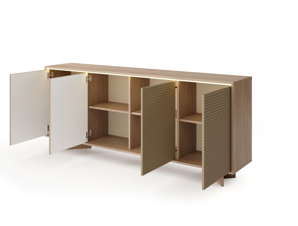 Nowoczesna komoda do salonu SENSO została zaprojektowana z myślą o wygodzie użytkowania. System otwierania push-to-open eliminuje potrzebę stosowania uchwytów, co dodatkowo podkreśla minimalistyczny styl i zapewnia komfort codziennego korzystania. Cztery pojemne szafki pozwalają na wygodne przechowywanie zastawy, tekstyliów czy innych niezbędnych przedmiotów, pomagając utrzymać porządek w domu.