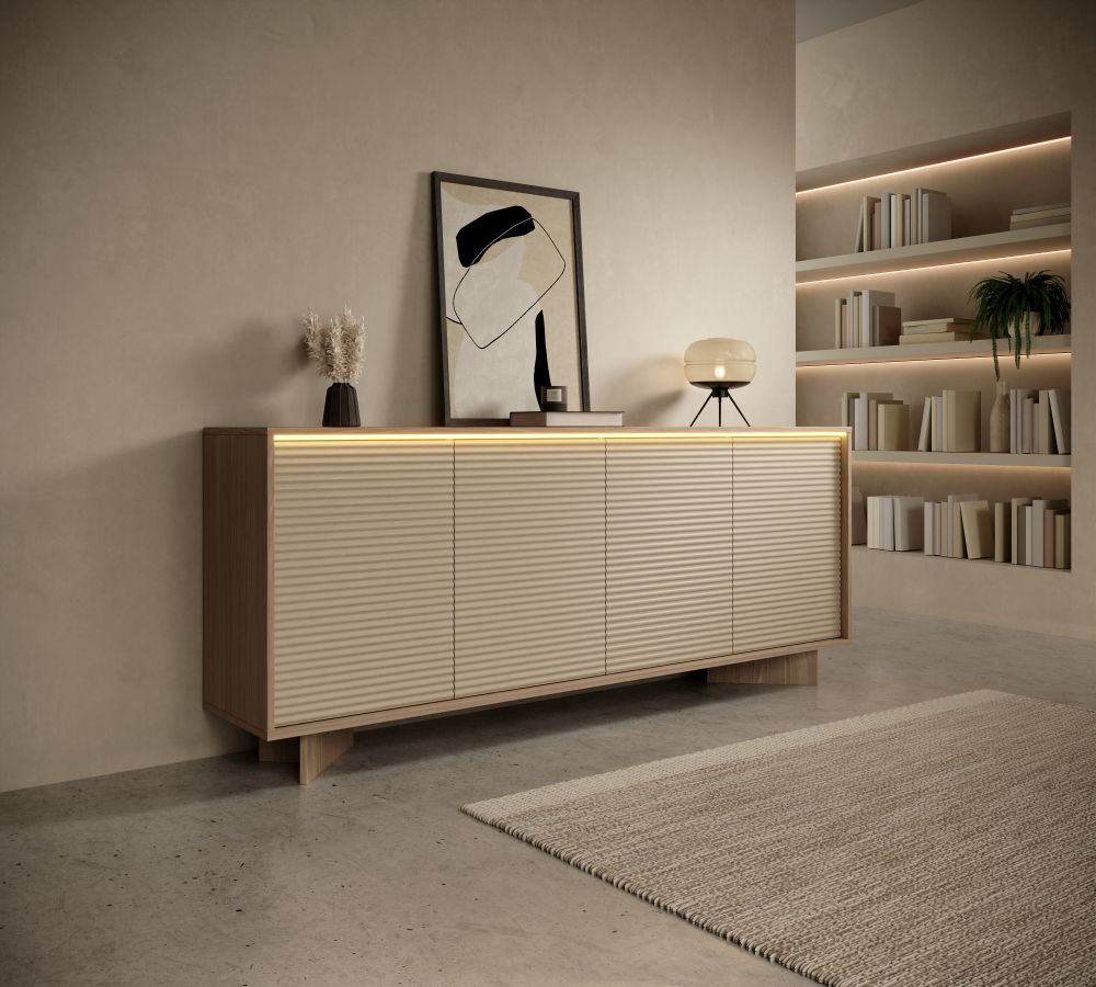 Komoda SENSO przyciąga uwagę swoim wyjątkowym wyglądem. Ryflowane fronty w modnym kolorze cappuccino w połączeniu z ciepłym odcieniem korpusu bolivar naturalny tworzą harmonijną i ponadczasową kompozycję. Subtelne oświetlenie LED umieszczone pod górnym blatem podkreśla strukturę frontów i nadaje meblowi eleganckiego charakteru, budując przytulną atmosferę w pomieszczeniu.