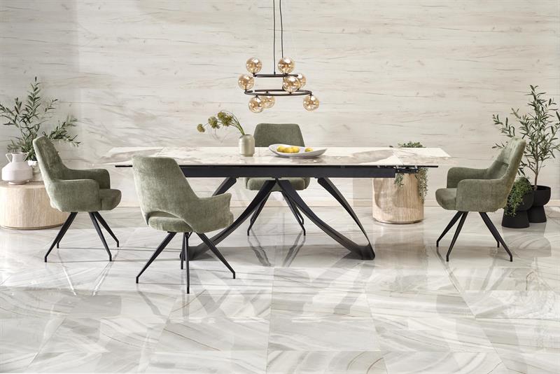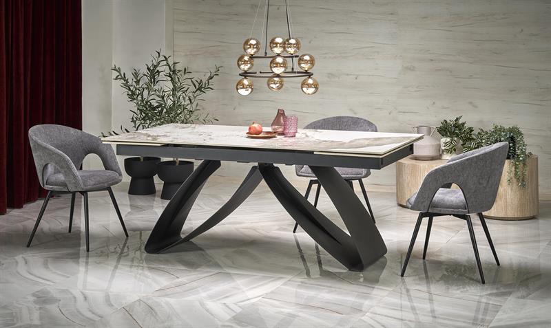 Stół HILARIO to propozycja dla osób, które oczekują spektakularnego designu, funkcjonalności i bezkompromisowej jakości. Elegancki blat w wykończeniu białego marmuru nadaje wnętrzu luksusowy charakter, a solidna, czarna podstawa ze stali malowanej proszkowo podkreśla nowoczesny styl i zapewnia wyjątkową stabilność.