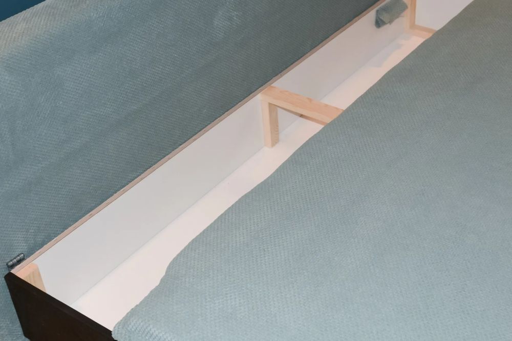 Konstrukcja oparta na solidnym stelażu z płyty meblowej i litego drewna zapewnia stabilność oraz wieloletnią trwałość. Dodatkowy pojemnik na pościel to praktyczne rozwiązanie, które ułatwia przechowywanie i utrzymanie porządku.