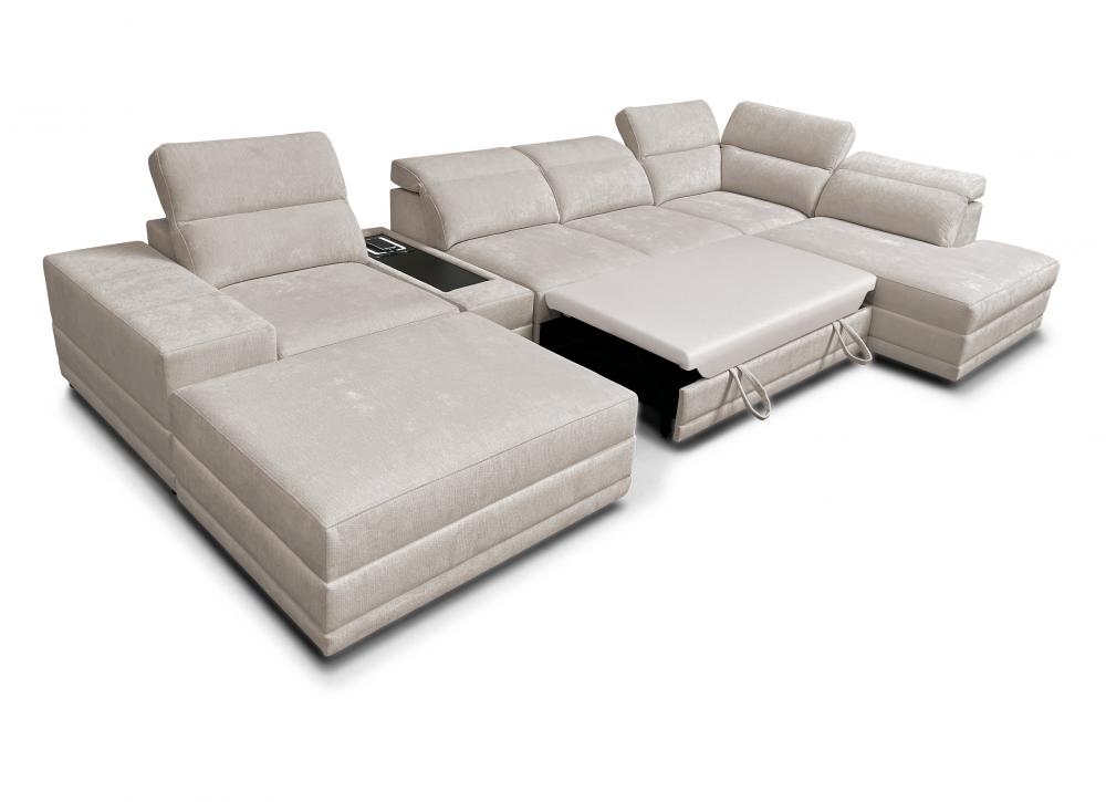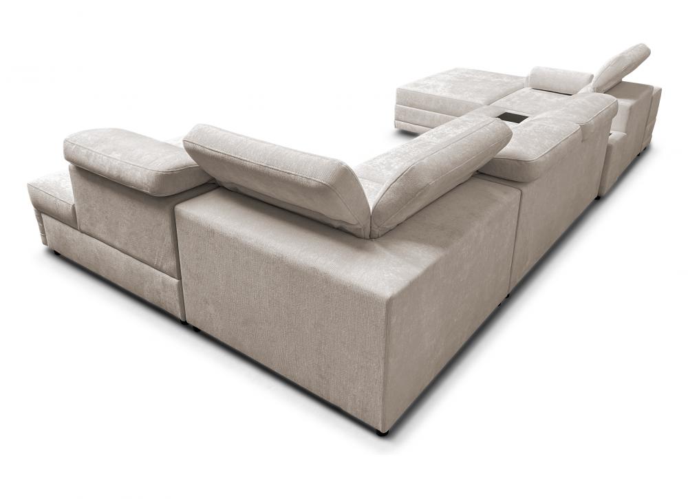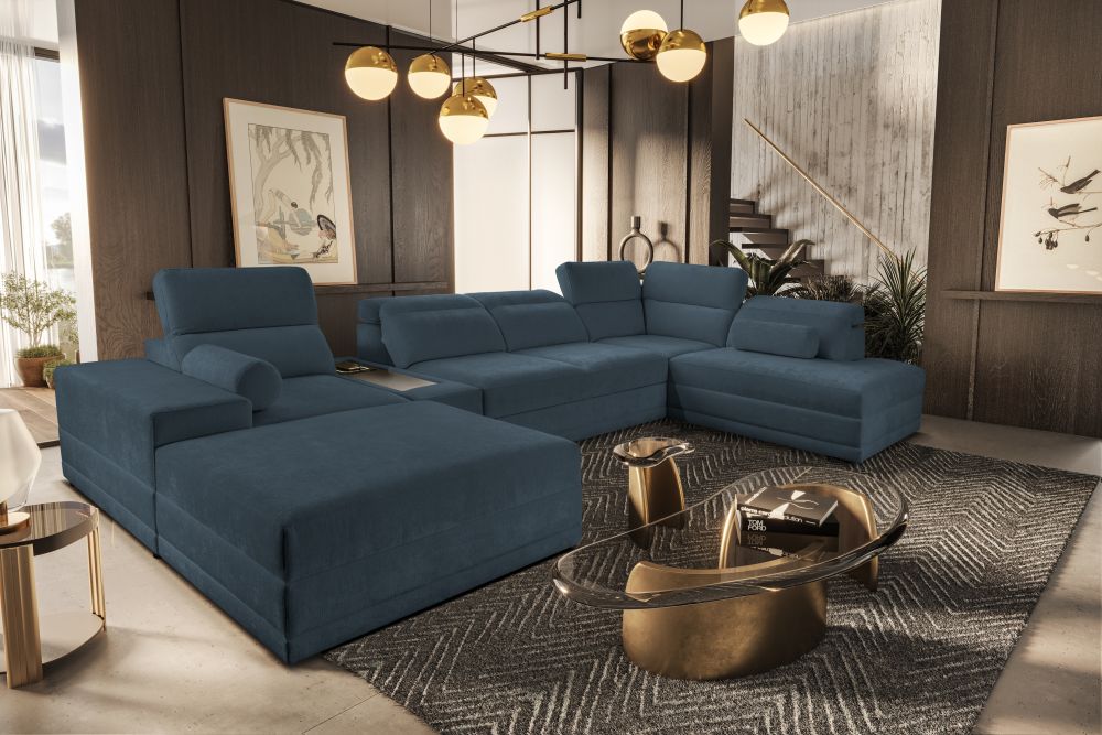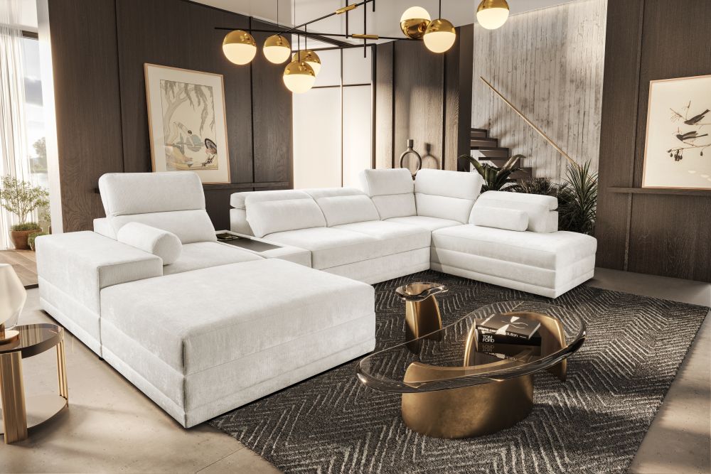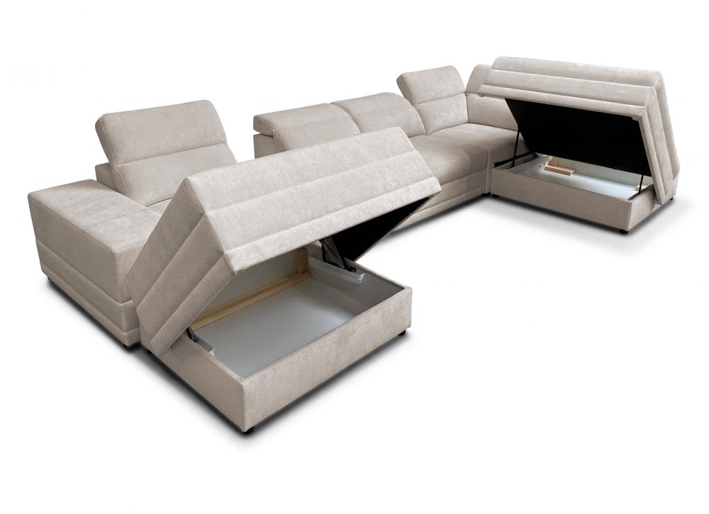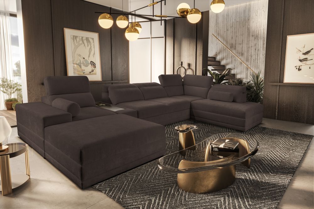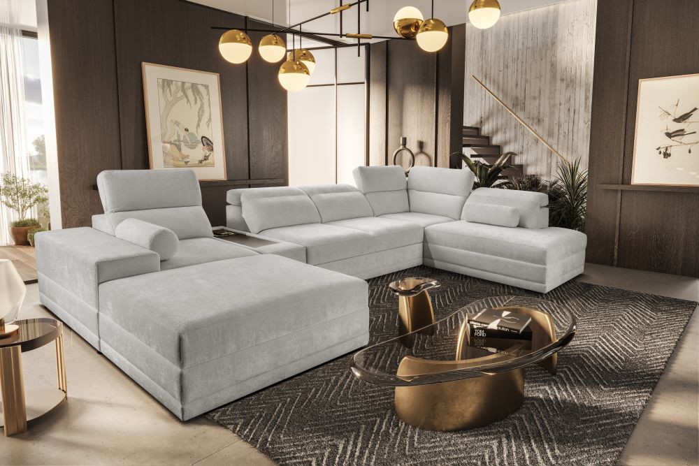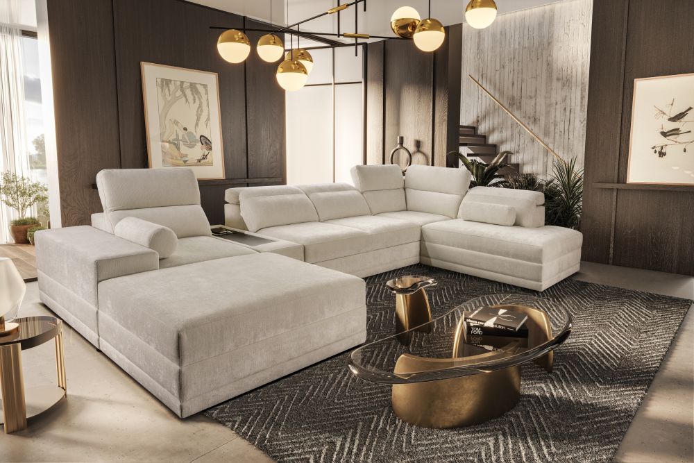 Rozkładana kanapa w kształcie litery U ASTON 5 to propozycja dla osób, które szukają wyjątkowego komfortu, nowoczesnego designu oraz praktycznych rozwiązań do dużego salonu. Ten imponujący narożnik świetnie sprawdzi się w przestronnych wnętrzach – zarówno w domach jednorodzinnych, jak i w dużych apartamentach. Dzięki swojej formie tworzy idealną strefę relaksu, w której swobodnie odpocznie cała rodzina i goście.