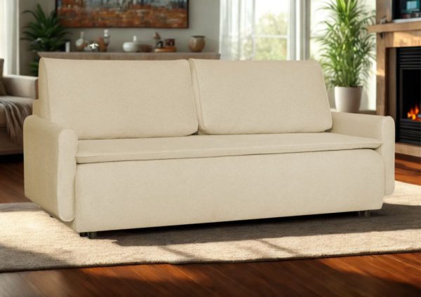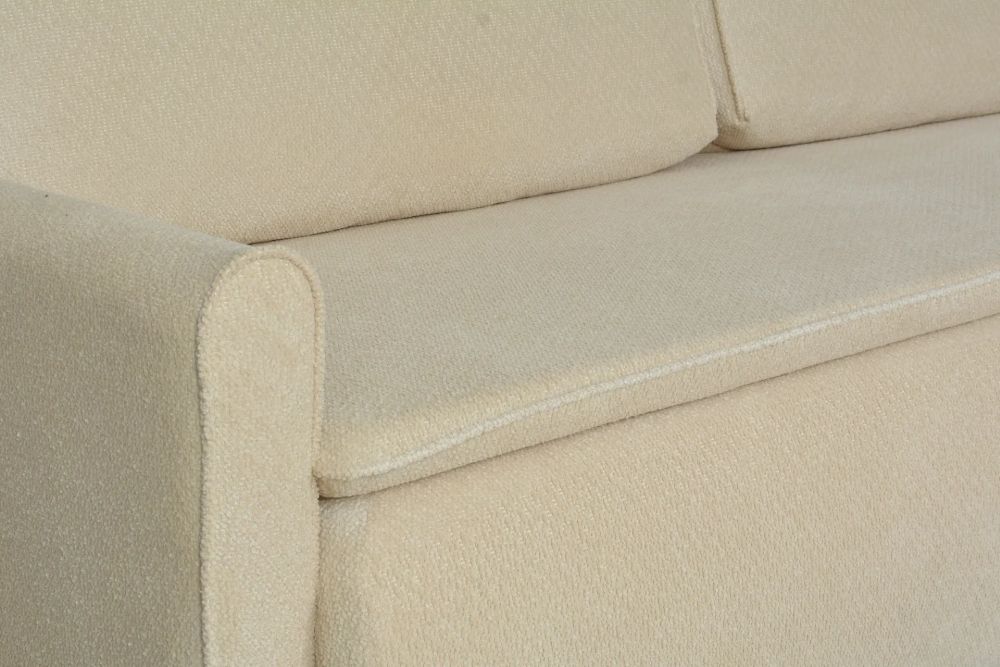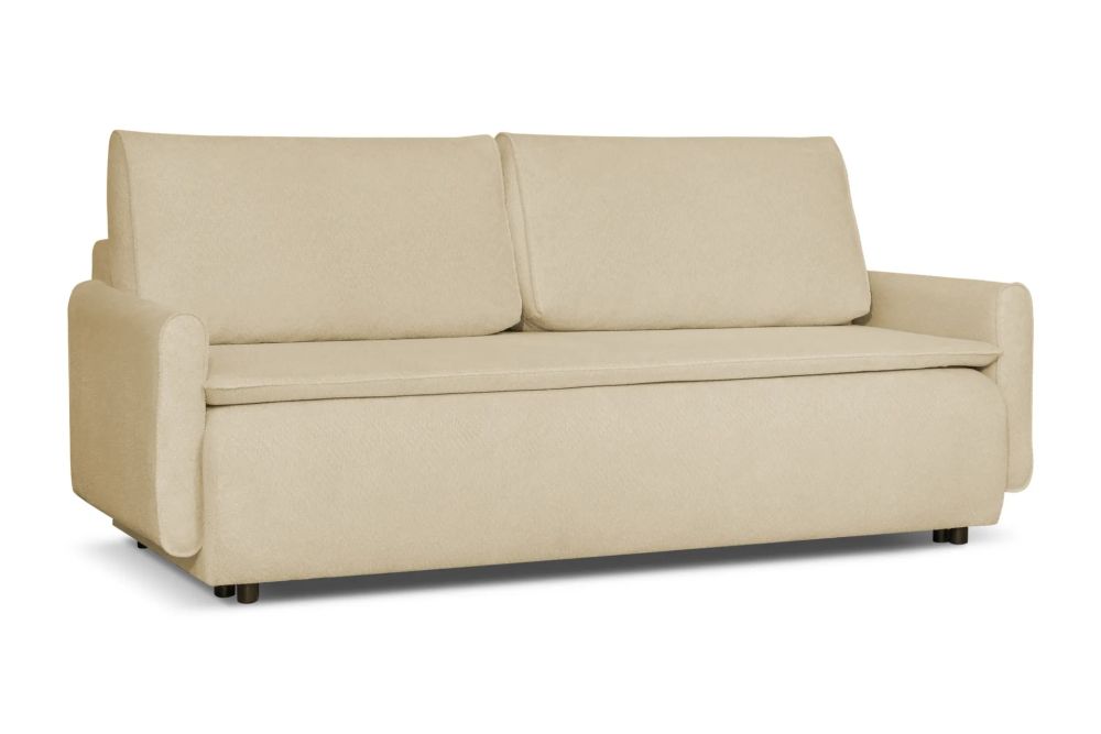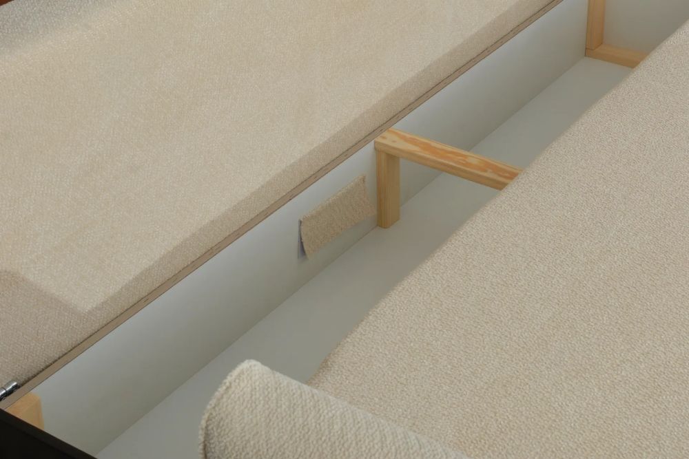 Dużym atutem jest pojemnik na pościel, który ułatwia przechowywanie kołdry i poduszek, pomagając utrzymać porządek w pomieszczeniu. Tapicerowane plecy tkaniną sprawiają, że kanapa jest meblem wolnostojącym i może zostać ustawiona również na środku salonu.