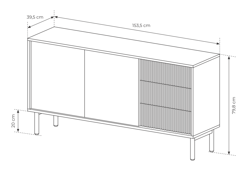 Komoda o wymiarach 153,5 × 79,8 × 39,5 cm doskonale sprawdzi się w salonie, sypialni czy jadalni, oferując praktyczną przestrzeń do przechowywania. Plecy wykonane z płyty HDF w dekorze dąb sonoma stanowią estetyczne dopełnienie całości.