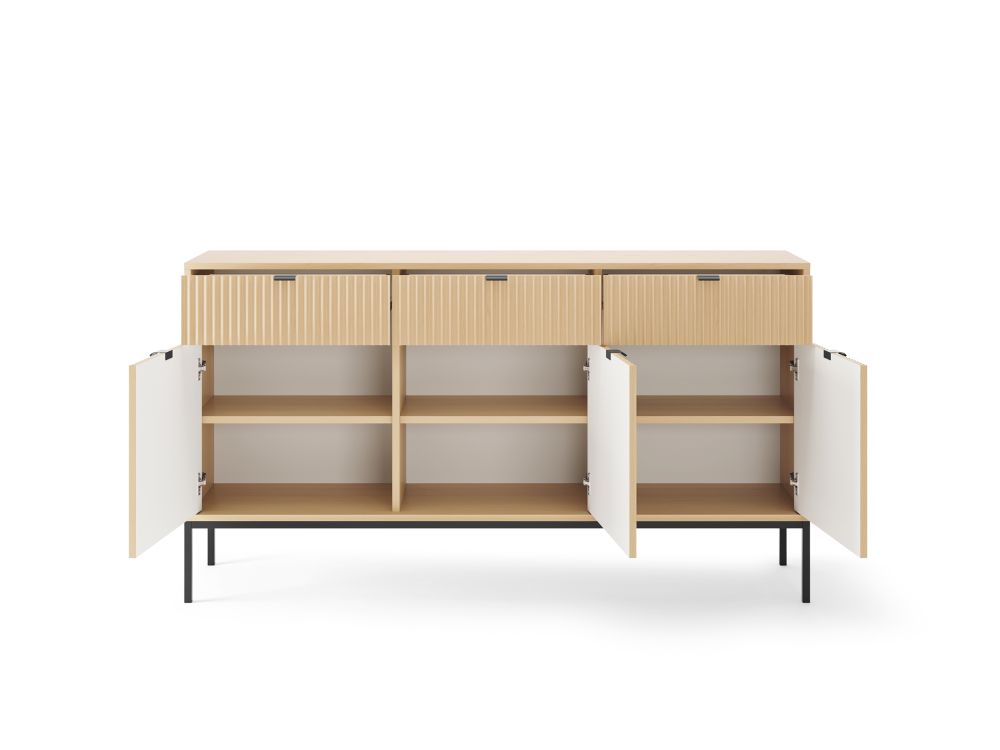 Dzięki doskonale przemyślanym wymiarom – 154 cm szerokości, 39 cm głębokości i 83 cm wysokości – komoda oferuje komfortową przestrzeń do przechowywania, zachowując jednocześnie szykowną i zrównoważoną formę.