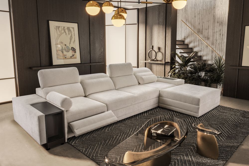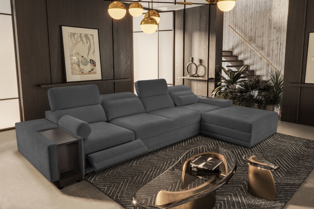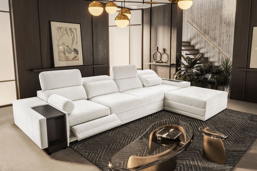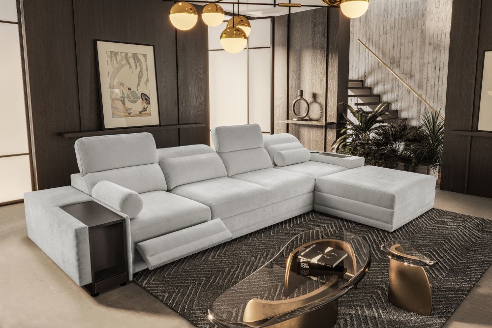Jednym z największych atutów tego modelu jest elektrycznie wysuwany podnóżek, który umożliwia przyjęcie pozycji półleżącej i relaks niczym w luksusowym fotelu wypoczynkowym. Dodatkowo narożnik został wyposażony w zamykany barek z praktyczną wnęką, idealny na napoje, przekąski lub piloty. Nowoczesnym dodatkiem jest także bezprzewodowa ładowarka indukcyjna z funkcją lampki, która umożliwia wygodne ładowanie telefonu bez kabli – wystarczy odłożyć smartfon w wyznaczone miejsce.