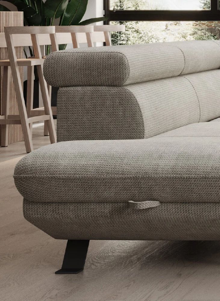 Dzięki praktycznej funkcji spania typu DELFIN, narożnik w kilka chwil zamienia się w wygodne łóżko o powierzchni 267 × 125 cm – idealne dla gości lub codziennego użytku. Wbudowany pojemnik na pościel pozwala utrzymać porządek, zapewniając dodatkowe miejsce do przechowywania.