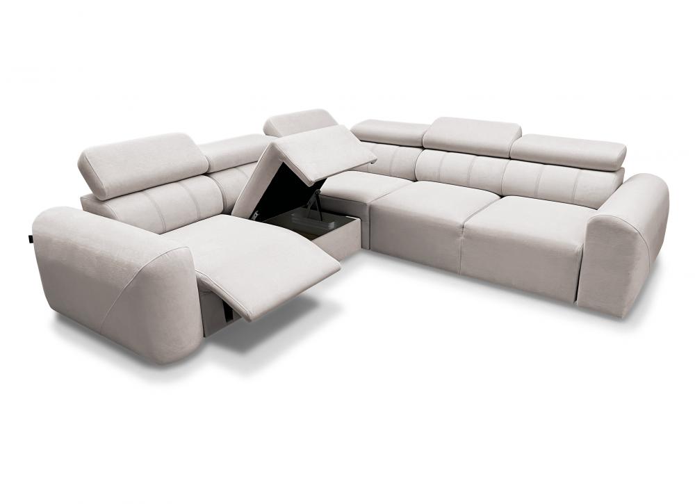AMADEUSZ 3 MIX to nie tylko funkcja spania, ale także szereg udogodnień. Narożnik wyposażony został w elektrycznie rozkładany podnóżek, który pozwala na jeszcze większy relaks, a także w pojemny schowek na pościel, pomagający utrzymać porządek. Dodatkowym atutem jest aż 6 regulowanych zagłówków, które można dopasować indywidualnie do swoich potrzeb.