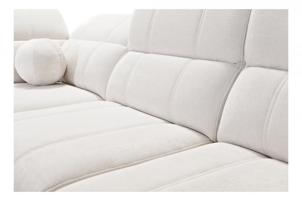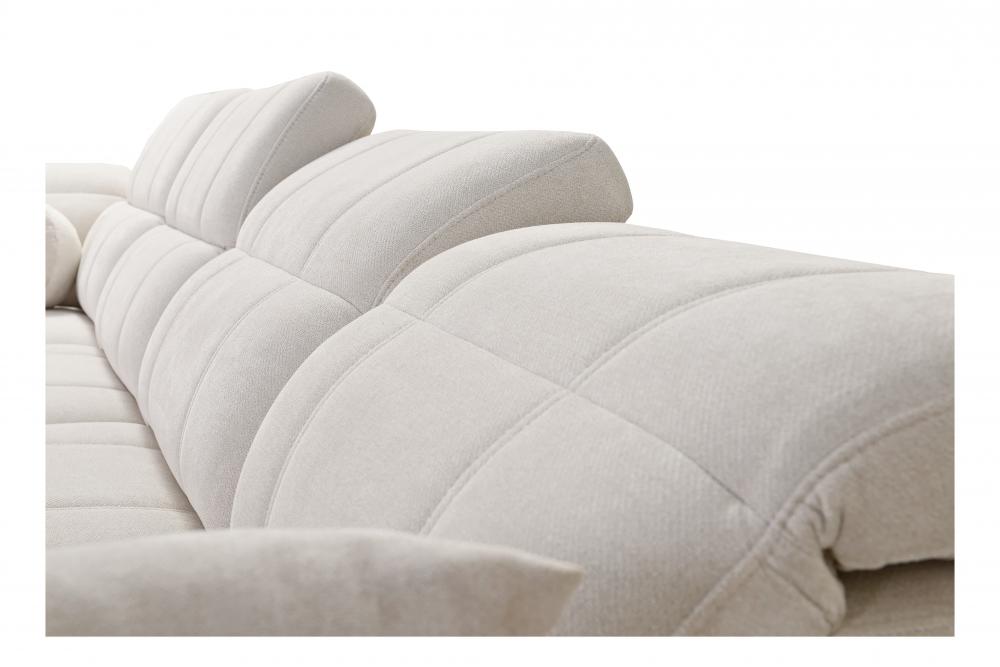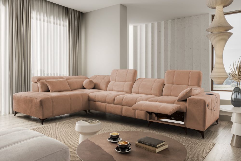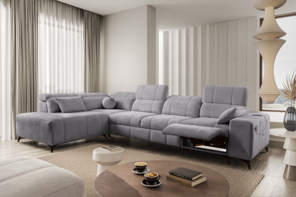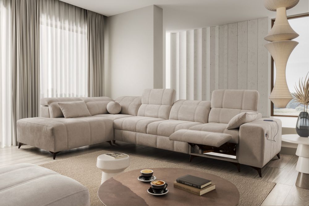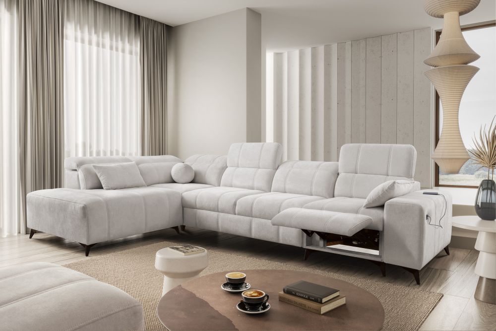 Już od pierwszego kontaktu DOLCE 11 MIX robi wrażenie swoją skalą i elegancką linią. Duże, miękkie siedziska, sześć regulowanych zagłówków oraz idealnie wyprofilowane oparcia zapewniają wysoki komfort zarówno podczas codziennego wypoczynku, jak i długich wieczorów z rodziną czy gośćmi. Elektrycznie rozkładany podnóżek to funkcja, która naprawdę robi różnicę – wystarczy jeden ruch, by zamienić narożnik w prywatną strefę relaksu.