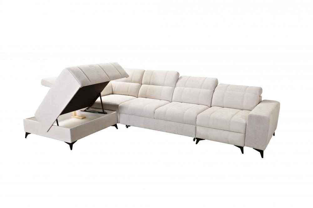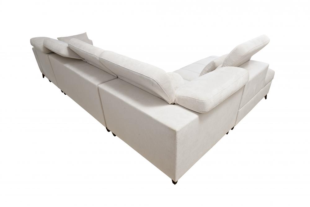 Model został wyposażony w funkcję spania codziennego z automatem DELFIN, dzięki czemu rozkładanie jest szybkie i bezproblemowe, a powierzchnia spania wygodna i stabilna. Praktyczny pojemnik na pościel ułatwia organizację przestrzeni, a obite tkaniną plecy pozwalają ustawić narożnik także na środku salonu.