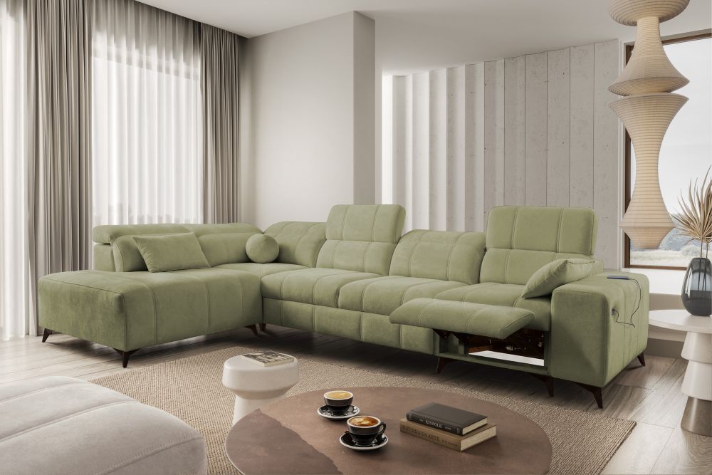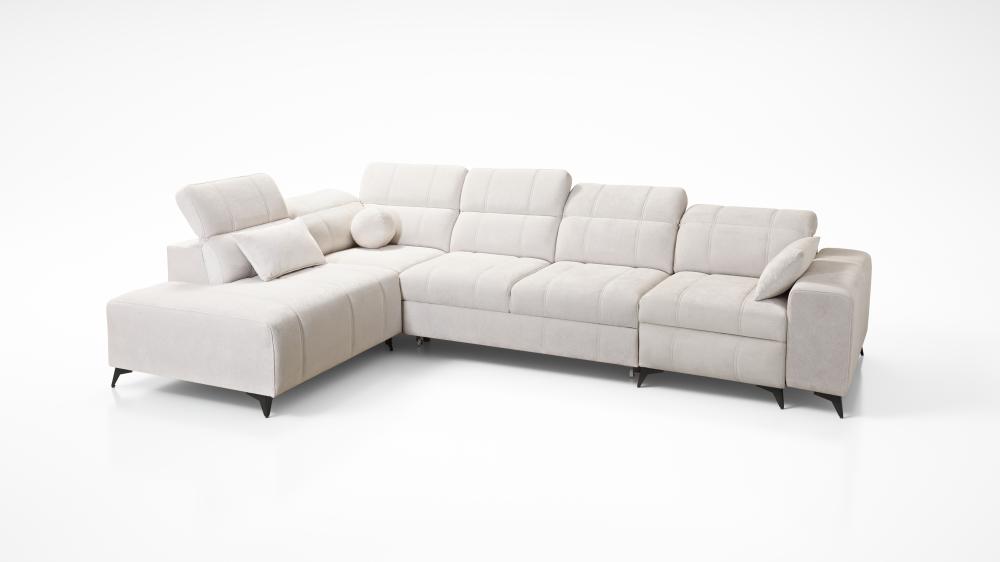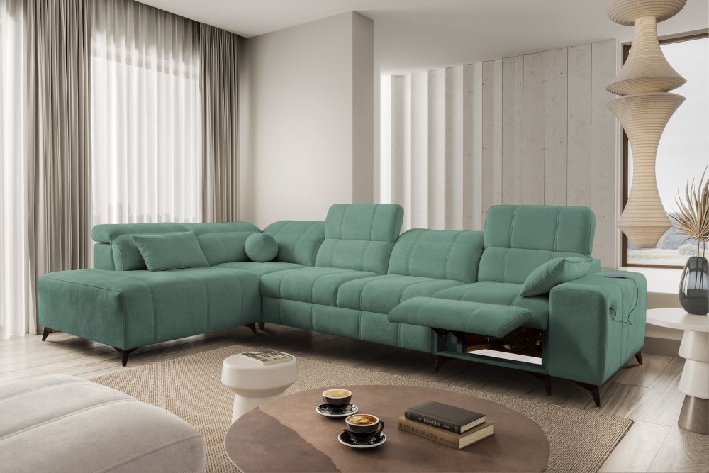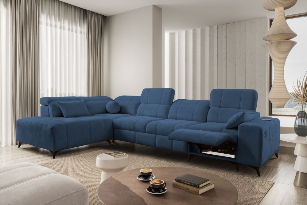 Ogromnym atutem są piękne tkaniny do wyboru – tapicerki klasy premium, które nie tylko świetnie wyglądają, ale również są trwałe i przyjemne w dotyku. Dzięki szerokim możliwościom personalizacji bez problemu dopasujesz narożnik do swojego wnętrza – od koloru tkaniny, przez wykończenie nóg, aż po detale takie jak gniazdo USB.
