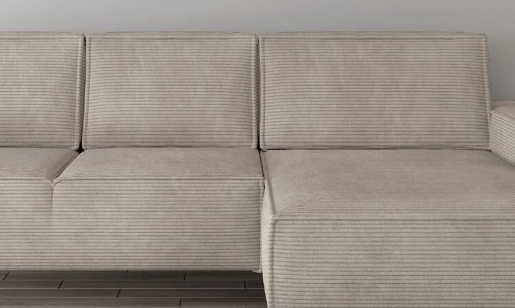 W codziennym użytkowaniu narożnik zachwyca praktycznością — funkcja spania z systemem delfin (wysuwny wózek) umożliwia szybkie, wygodne rozłożenie dużej powierzchni spania 129 × 225 cm, idealnej dla dwóch osób. Dodatkowym atutem jest ukryty pojemnik na pościel o wymiarach 135 × 62 × 13 cm, który pomieści koce, poduszki lub zapasową kołdrę.