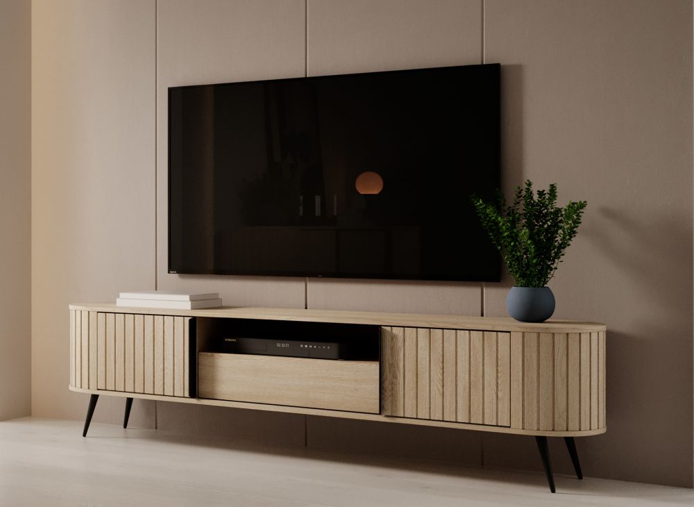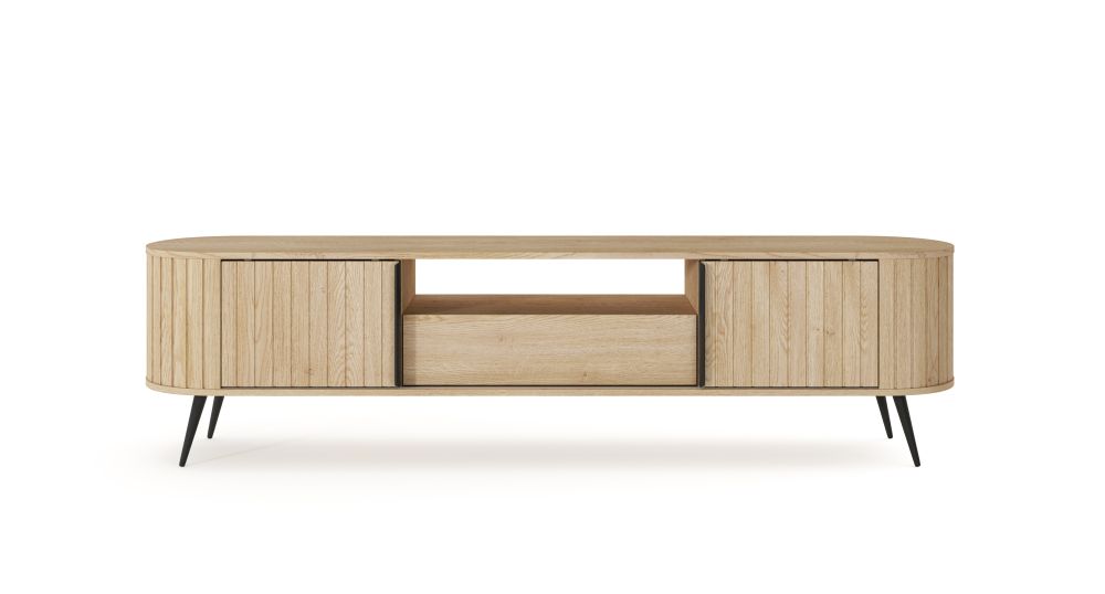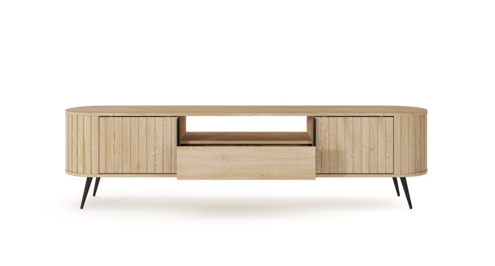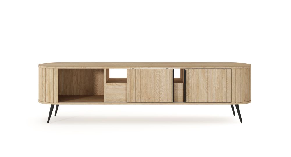Szafka RTV FLOW wyróżnia się owalną formą oraz subtelnymi, ryflowanymi frontami, które nadają jej wyjątkowego charakteru i lekkości wizualnej. Przesuwne drzwi to nie tylko estetyczny detal, ale również praktyczne rozwiązanie – pozwalają wygodnie zarządzać przestrzenią bez potrzeby dodatkowego miejsca na ich otwieranie. To szczególnie ważne w mniejszych pomieszczeniach, gdzie liczy się każdy centymetr.