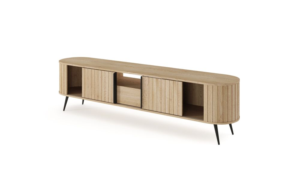 Owalna szafka RTV z przesuwnymi drzwiami 196 cm FLOW to idealne rozwiązanie dla osób, które cenią nowoczesny design, funkcjonalność i dopracowane detale. Ten stylowy mebel RTV doskonale wpisuje się w aktualne trendy wnętrzarskie, łącząc naturalne wybarwienie drewna z eleganckimi, zaoblonymi liniami. Dzięki temu świetnie sprawdzi się zarówno w salonach urządzonych w stylu nowoczesnym, skandynawskim, jak i japandi.