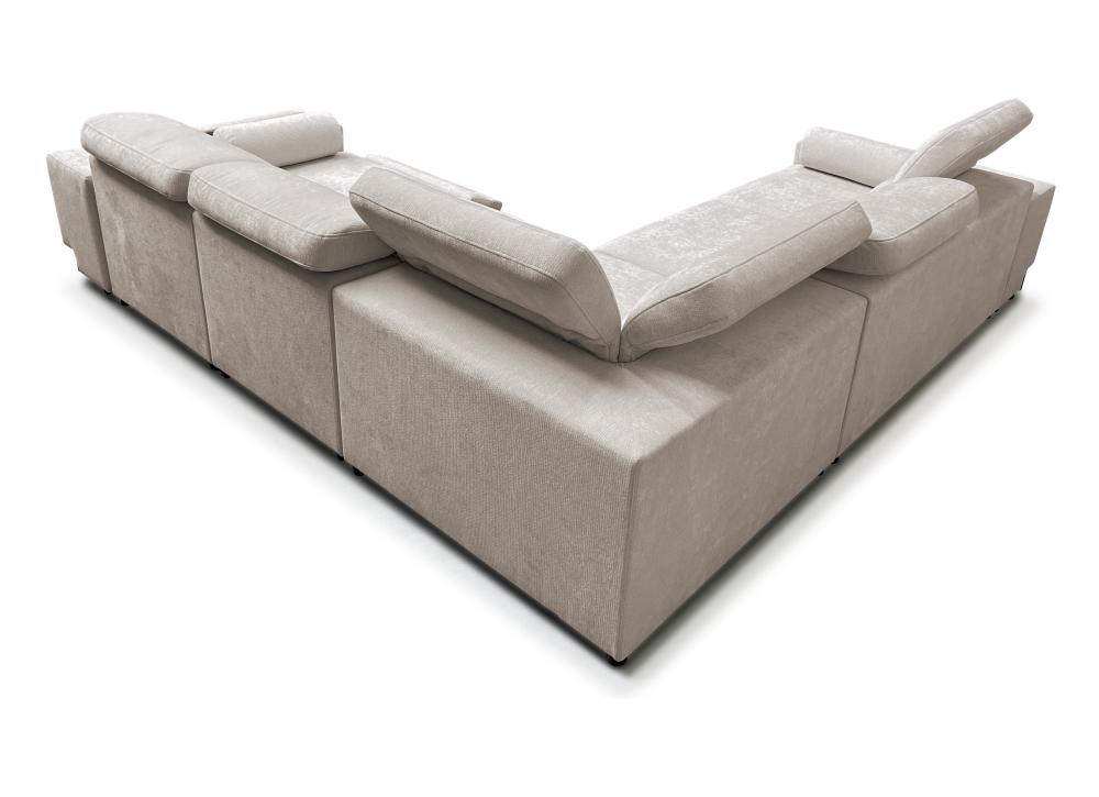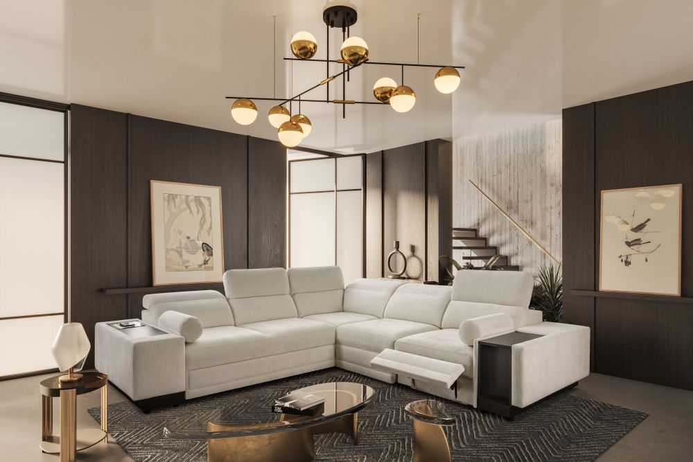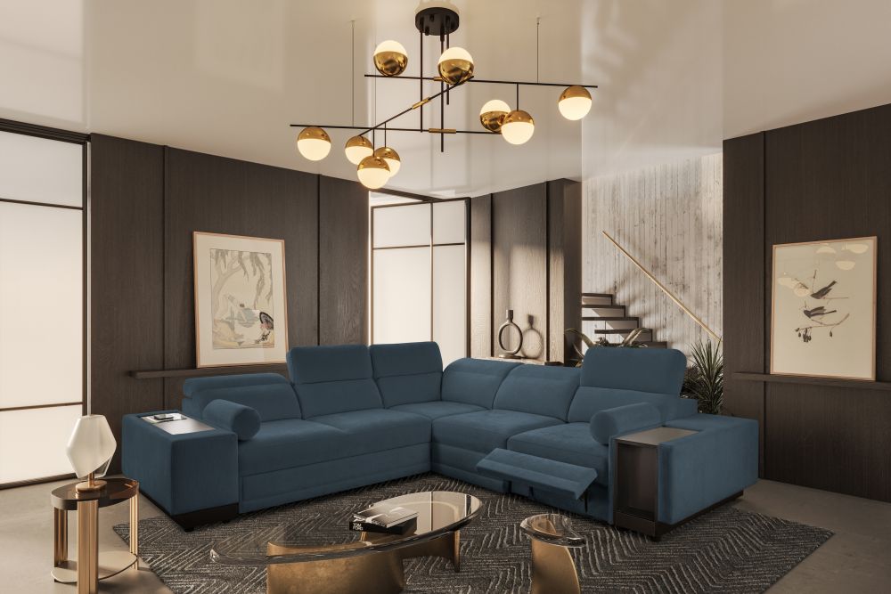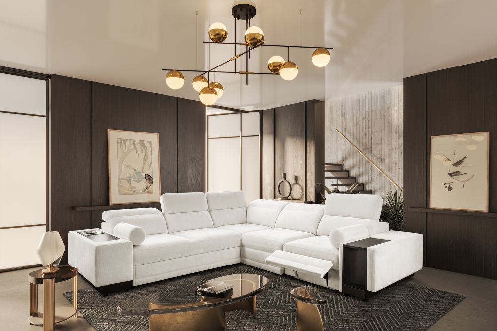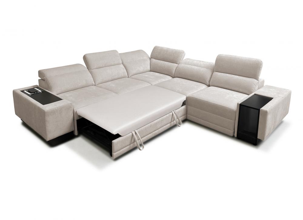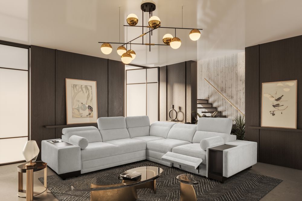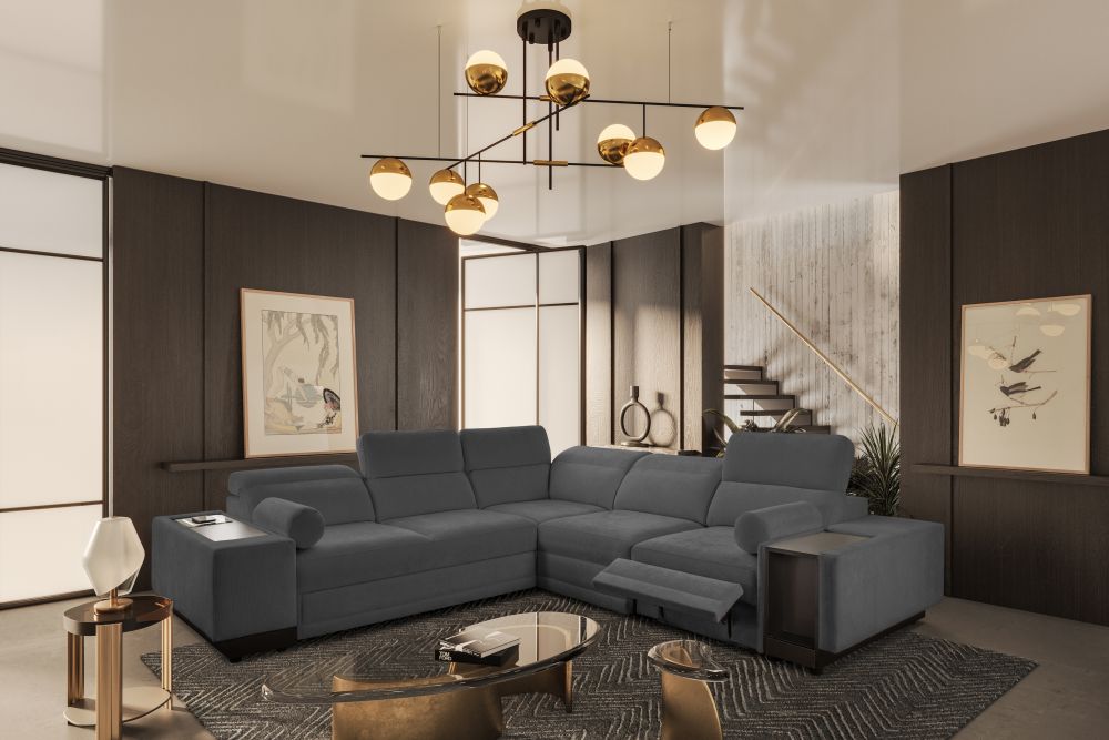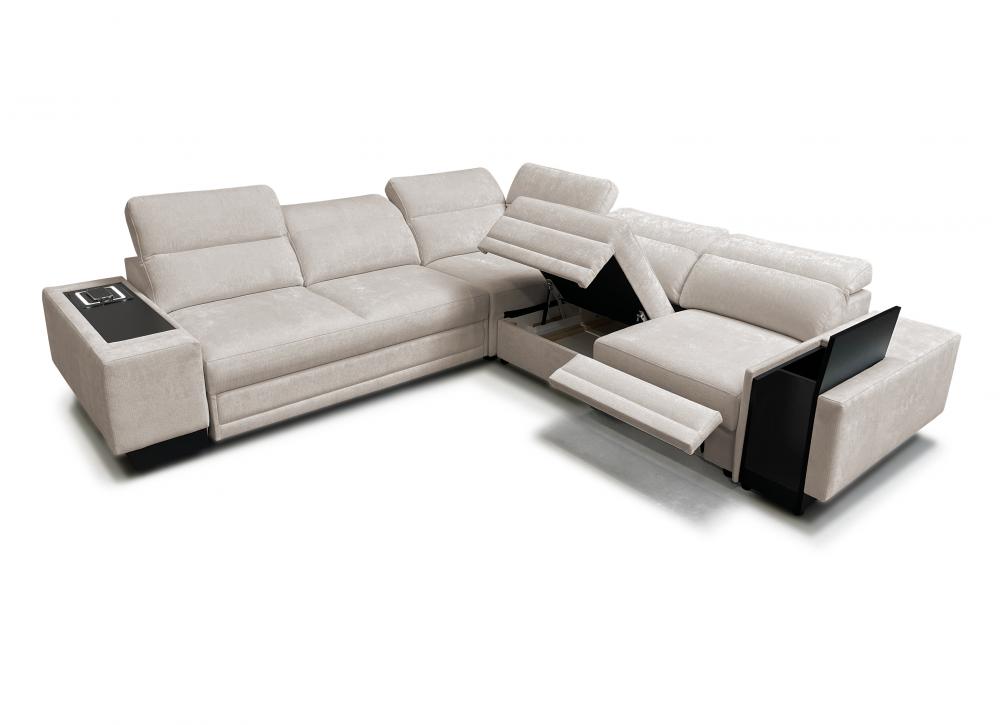 Narożnik został wyposażony w regulowane zagłówki, które pozwalają dostosować oparcie do preferowanej pozycji siedzenia. Elektrycznie wysuwany podnóżek umożliwia pełen relaks po ciężkim dniu, a zintegrowany zamykany barek z wnęką dodaje meblowi wyjątkowej funkcjonalności. Dodatkowo w narożniku znajduje się bezprzewodowa ładowarka indukcyjna z funkcją lampki o mocy do 15W, dzięki której można wygodnie naładować telefon bez użycia kabli.