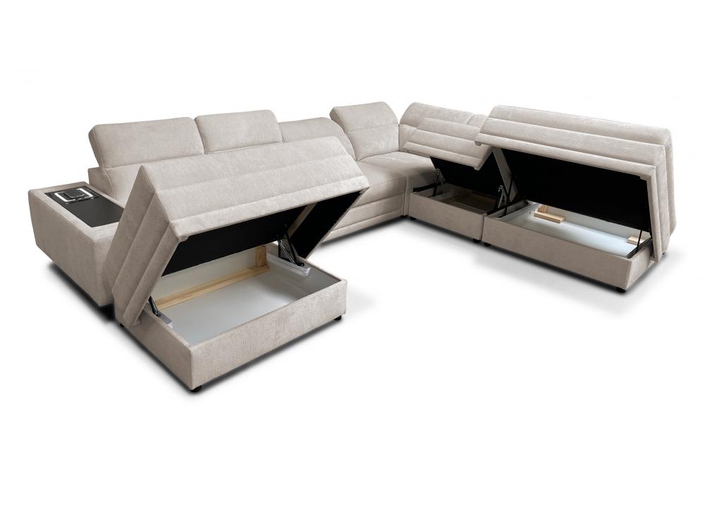 Mebel wyposażono w praktyczne rozwiązania, które podnoszą komfort użytkowania. Dwa pojemniki na pościel umożliwiają wygodne przechowywanie kołder i poduszek, a zamykany barek z elegancką wnęką pozwala na dyskretne przechowywanie drobiazgów. Dodatkowym udogodnieniem jest wbudowana bezprzewodowa ładowarka indukcyjna z funkcją lampki, dzięki której możesz wygodnie ładować telefon bez użycia kabli.