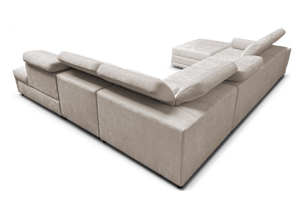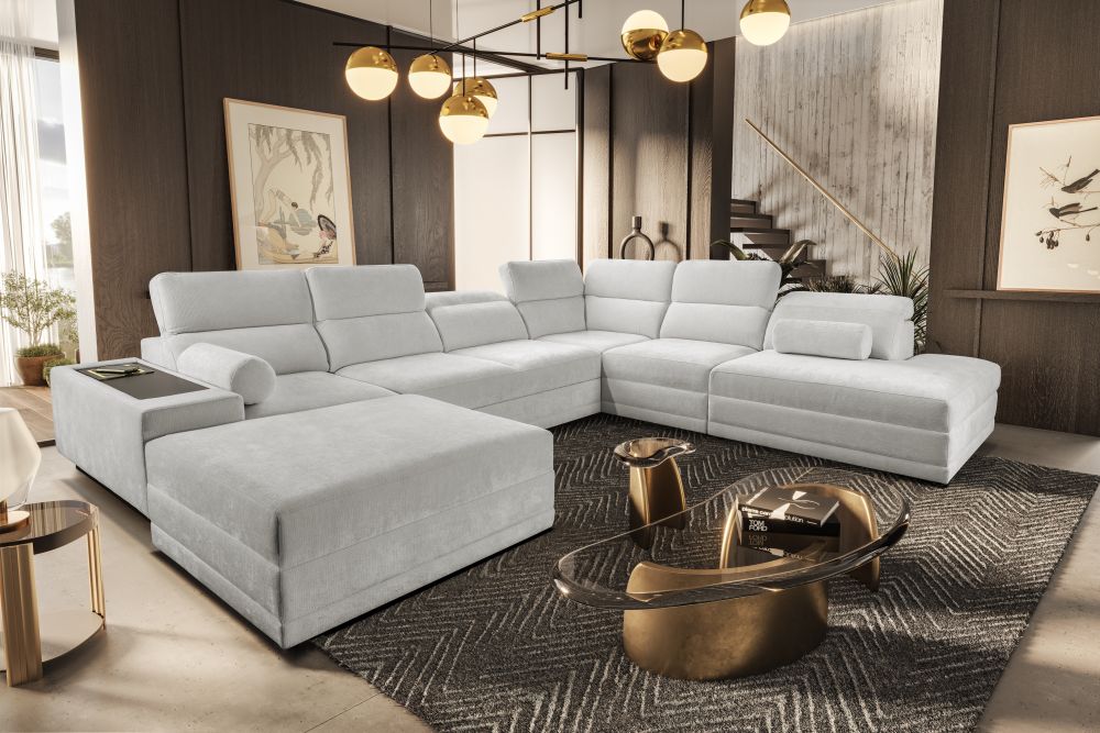 Za komfort siedzenia odpowiada połączenie sprężyny falistej oraz wysokiej jakości pianki T30, które gwarantują idealną sprężystość, trwałość oraz odporność na odkształcenia. Drewniany stelaż zapewnia stabilność i wytrzymałość konstrukcji, a regulowane zagłówki pozwalają na indywidualne dopasowanie pozycji wypoczynku. Tył narożnika jest w całości obity tkaniną, dzięki czemu mebel świetnie prezentuje się również ustawiony na środku pomieszczenia.