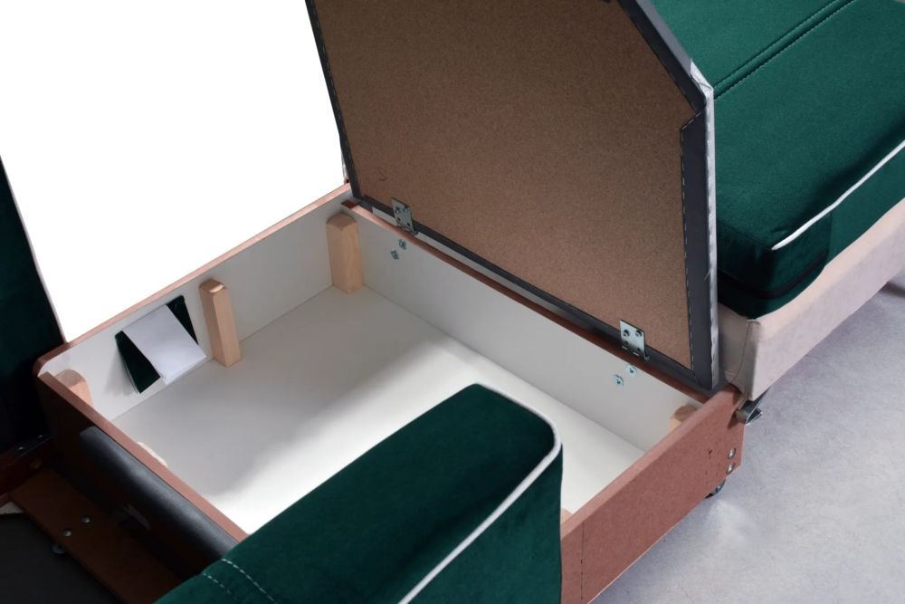 Dodatkowym atutem jest praktyczny pojemnik na pościel, który ułatwia przechowywanie kołdry, poduszek czy koca, pomagając utrzymać porządek w pomieszczeniu.