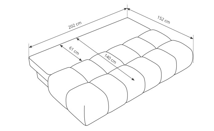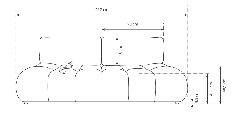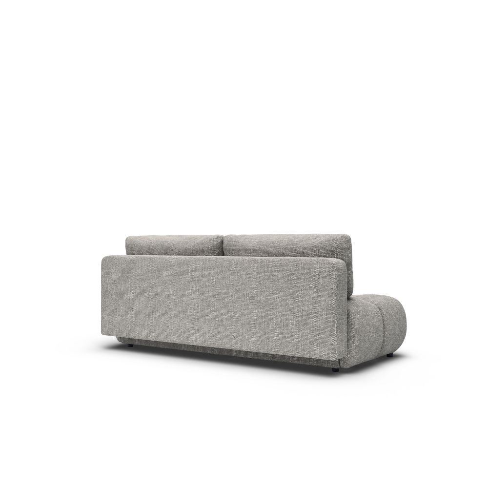 Sofa została zaprojektowana jako mebel wolnostojący – jej tył jest w pełni tapicerowany, co pozwala ustawić ją w dowolnym miejscu salonu. Całość dopełniają subtelne, czarne nóżki, które podkreślają nowoczesny charakter bryły.