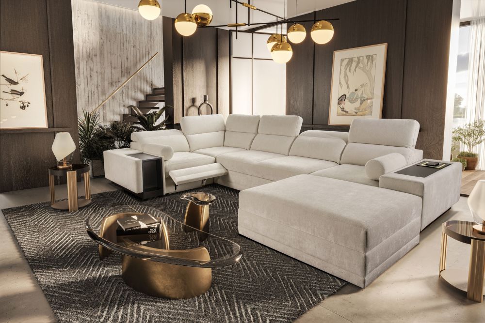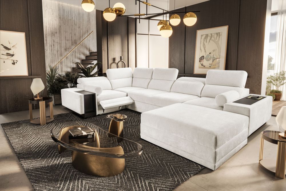 Ten nowoczesny narożnik U zachwyca również funkcjonalnością. Regulowane zagłówki pozwalają na indywidualne dopasowanie pozycji wypoczynku, natomiast elektrycznie rozkładany podnóżek umożliwia pełny relaks po długim dniu. Dodatkowym atutem jest zamykany barek z wnęką, idealny do przechowywania napojów, akcesoriów czy drobiazgów. Wbudowana bezprzewodowa ładowarka indukcyjna z funkcją lampki o mocy do 15W pozwala na wygodne ładowanie telefonu bez konieczności używania kabli – wystarczy odłożyć smartfon w wyznaczone miejsce.