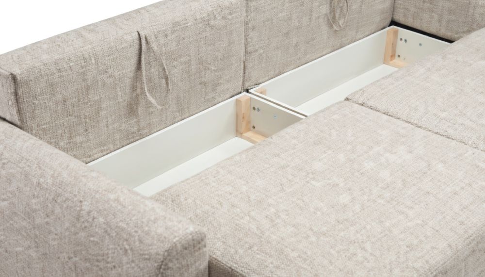 Dodatkowym atutem jest pojemny schowek na pościel, który pozwala wygodnie przechowywać kołdry, poduszki lub inne tekstylia. To praktyczne rozwiązanie szczególnie docenią osoby, które chcą maksymalnie wykorzystać przestrzeń w salonie lub mieszkaniu.
