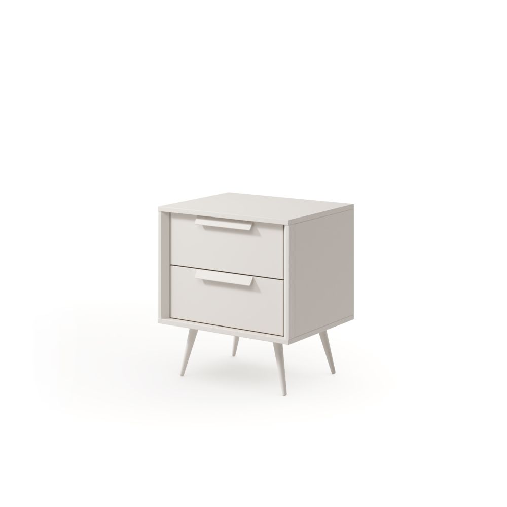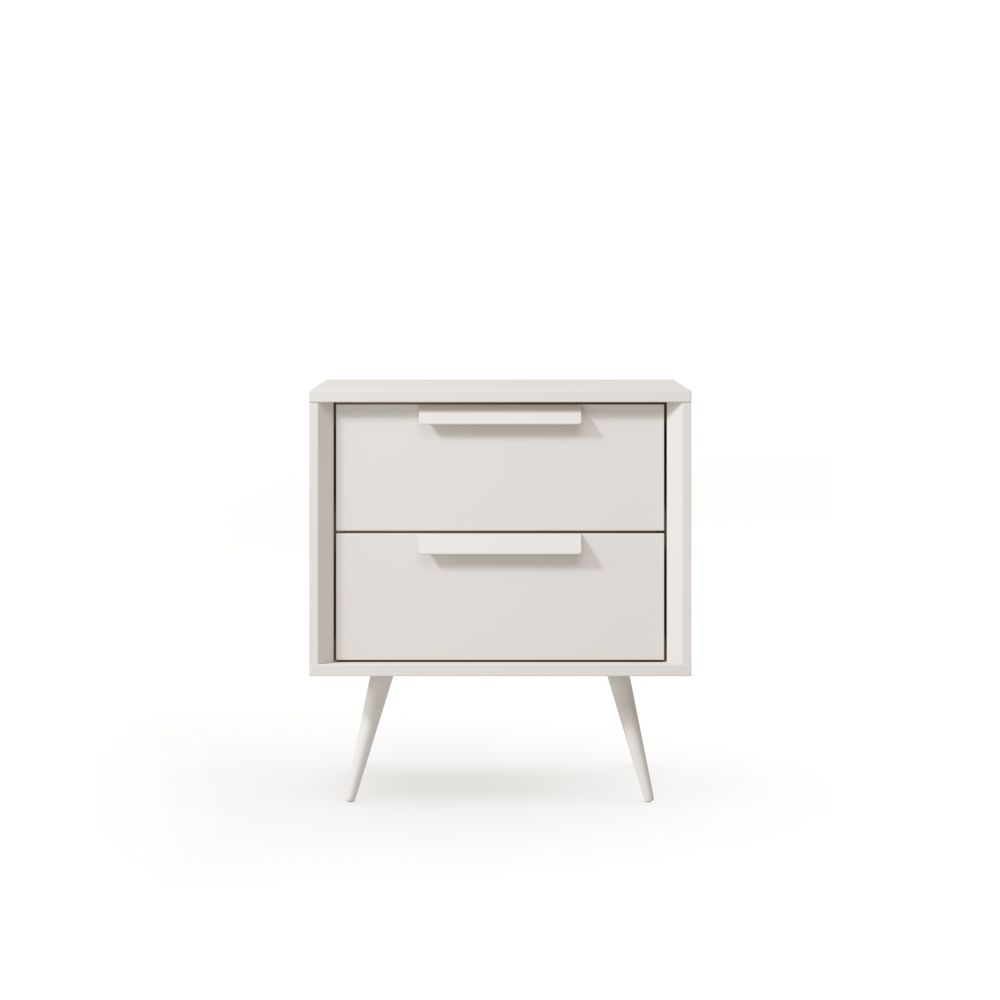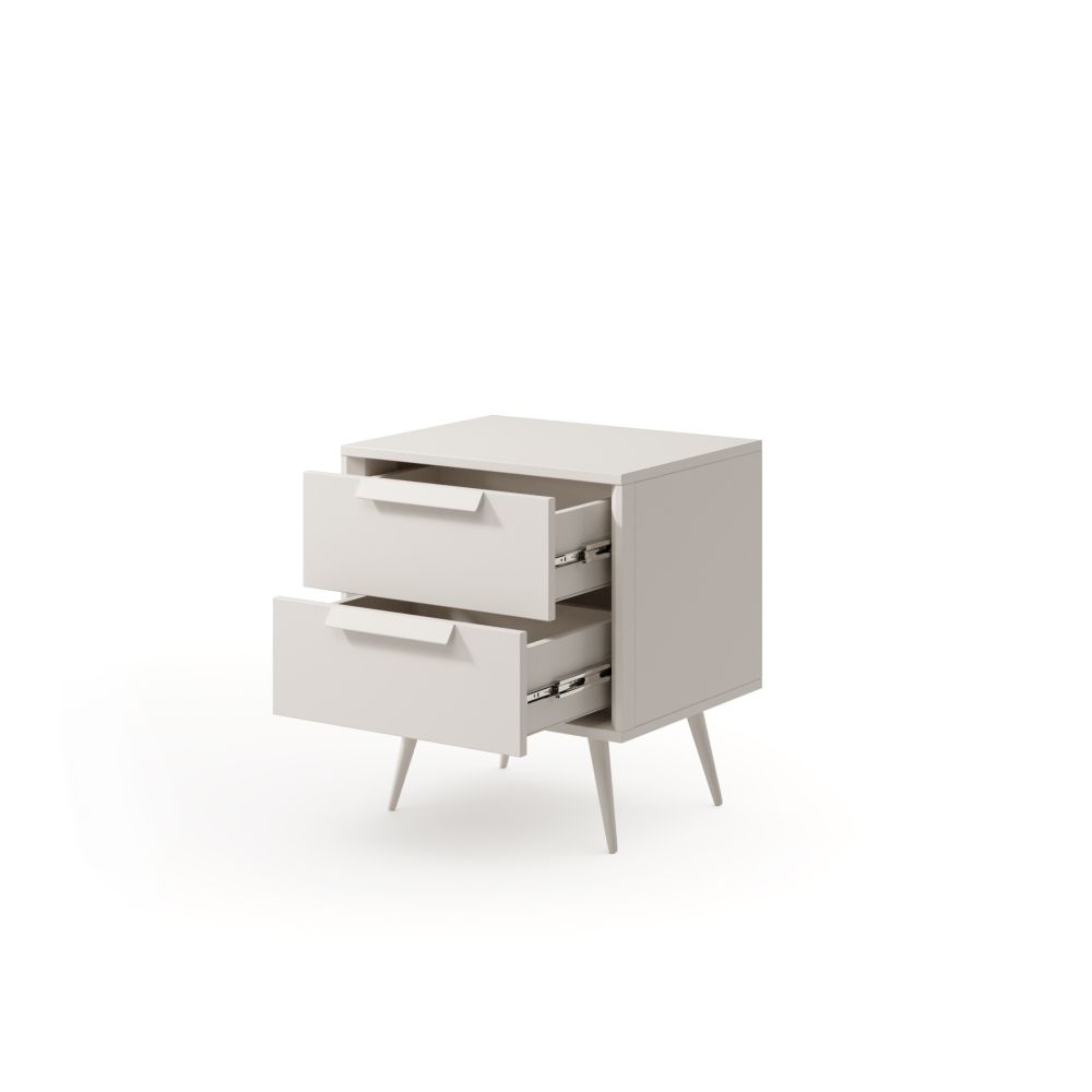 Ten nowoczesny stolik nocny został zaprojektowany z myślą o codziennym komforcie użytkowania. Dwie pojemne szuflady pozwalają na wygodne przechowywanie najpotrzebniejszych przedmiotów, takich jak książki, akcesoria czy drobiazgi, które warto mieć zawsze pod ręką. Zastosowane prowadnice kulkowe z pełnym wysuwem i funkcją domyku zapewniają płynne oraz ciche działanie, co znacząco podnosi komfort użytkowania, szczególnie w sypialni.