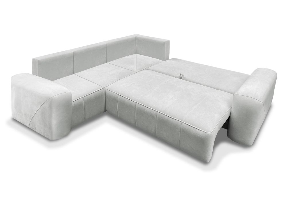 Ten superkomfortowy narożnik to także wygodne spanie dzięki funkcjonalnemu systemowi rozkładania DL, który pozwala szybko i łatwo przekształcić go w pełnowymiarowe łóżko. Duża powierzchnia spania 205 × 125 cm sprawdzi się idealnie zarówno dla gości, jak i jako codzienne miejsce wypoczynku. Dodatkowym atutem jest pojemnik na pościel, który zapewnia dyskretne miejsce do przechowywania kołder, poduszek czy koców.