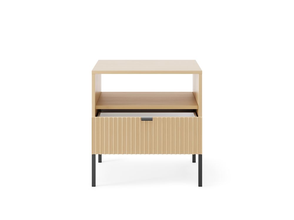 Solidne, czarne metalowe nogi i uchwyty nadają meblowi lekkości i loftowego wyrazu, a jednocześnie zapewniają stabilność i trwałość. To idealne połączenie praktyczności i designu na najwyższym poziomie. Szafka posiada idealne proporcje, które świetnie sprawdzą się zarówno przy łóżku, jak i jako designerski stolik pomocniczy w salonie.