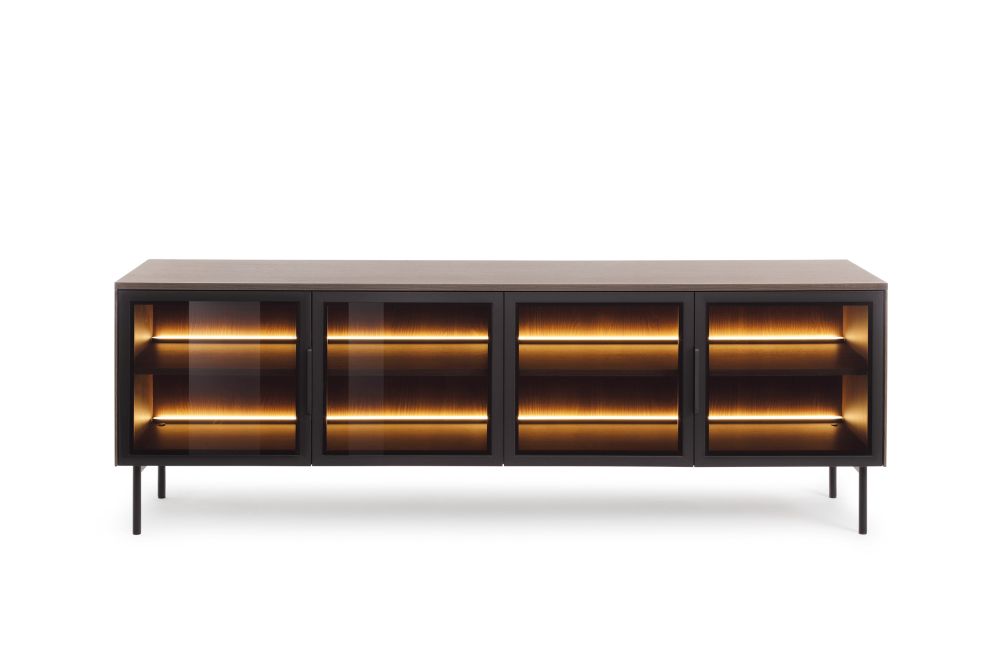 Mebel został wyposażony w cztery przeszklone drzwi, które nie tylko pięknie eksponują wnętrze, ale również podkreślają je dzięki oświetleniu LED w zestawie – w ciepłej białej barwie. Szafka stoi na wysokich, metalowych nogach (13,8 cm), co dodaje jej lekkości wizualnej i ułatwia utrzymanie porządku pod meblem.