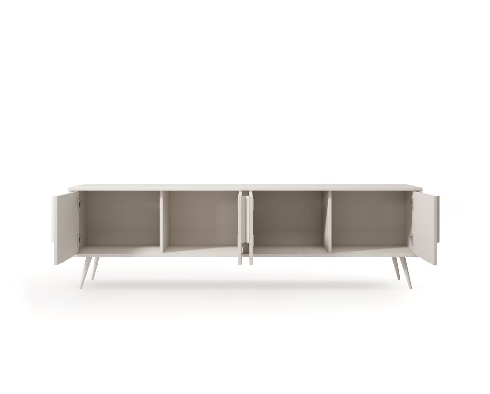 Model SATIN został zaprojektowany z myślą o wygodnym przechowywaniu sprzętu RTV oraz dodatków. Przemyślany układ czterech szafek zapewnia dużo miejsca na elektronikę, dokumenty czy akcesoria, pomagając utrzymać porządek w strefie wypoczynkowej. Dzięki zastosowaniu zawiasów i prowadnic z systemem cichego domyku, codzienne użytkowanie mebla jest wyjątkowo komfortowe i bezgłośne.