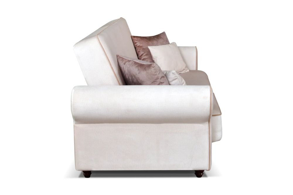 Wersalka YORK została wyposażona w cztery wygodne poduszki w zestawie, które zwiększają komfort siedzenia i podkreślają jej klasyczny styl. Ozdobne lamówki dodają elegancji i dopracowanego wykończenia. Tapicerowane plecy tkaniną techniczną (wigofil) sprawiają, że mebel najlepiej prezentuje się ustawiony pod ścianą. Do wyboru są trzy warianty nóżek: bukowe, w kolorze orzecha lub czarne, co pozwala dopasować wersalkę do indywidualnej aranżacji wnętrza.