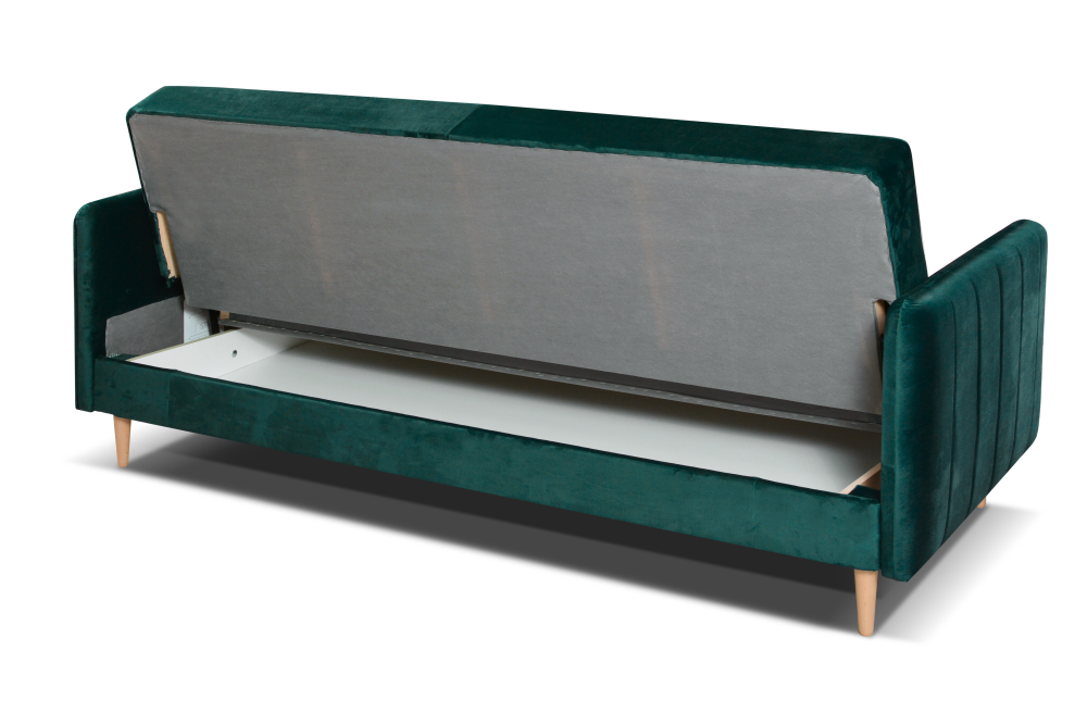 Dodatkowym atutem jest praktyczny pojemnik na pościel, który ułatwia przechowywanie i pomaga utrzymać porządek w salonie. Drewniane nóżki z naturalnego buku nadają całości eleganckiego charakteru i podkreślają solidność wykonania.