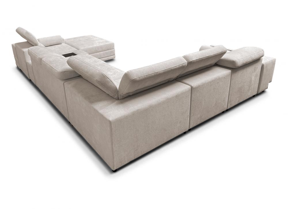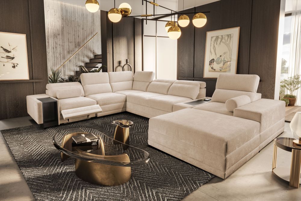 Narożnik w kształcie litery U zachwyca imponującymi wymiarami, dzięki czemu zapewnia dużo miejsca do siedzenia i wypoczynku. Regulowane zagłówki pozwalają dopasować oparcie do indywidualnych preferencji, a elektrycznie rozkładany podnóżek umożliwia przyjęcie idealnej pozycji relaksacyjnej – zarówno podczas oglądania telewizji, jak i popołudniowej drzemki. Komfort dodatkowo podnosi wysokiej jakości wypełnienie z pianki T30 i sprężyny falistej, które gwarantują odpowiednią sprężystość i trwałość na lata.