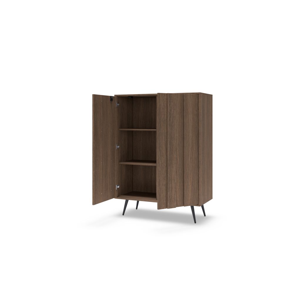 Wysoka komoda HEBAN w dekorze ciemnego drewna to doskonałe połączenie nowoczesnego designu, funkcjonalności i elegancji, które idealnie wpisuje się w aktualne trendy aranżacji wnętrz. Ten stylowy mebel świetnie sprawdzi się zarówno w salonie, sypialni, jak i przedpokoju, dodając przestrzeni charakteru i wyrafinowania. Dzięki kompaktowej formie i przemyślanej konstrukcji komoda oferuje dużą pojemność przy zachowaniu smukłej, estetycznej bryły.