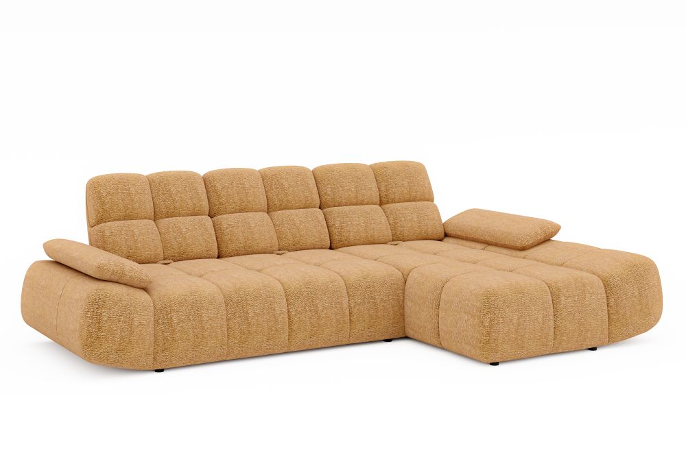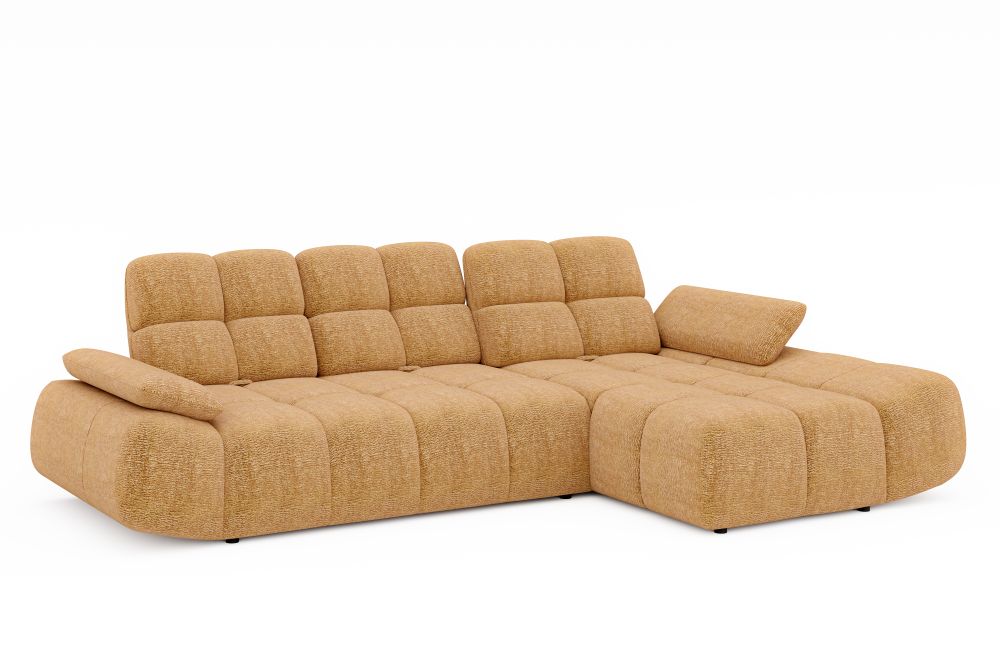 MELLARO 1 to mebel wolnostojący, co oznacza, że jego tył również został obity tkaniną. Daje to pełną swobodę aranżacyjną – narożnik świetnie wygląda zarówno ustawiony przy ścianie, jak i na środku salonu. Brak funkcji spania i pojemnika na pościel sprawia, że konstrukcja jest bardziej lekka wizualnie i skoncentrowana na maksymalnym komforcie wypoczynku.